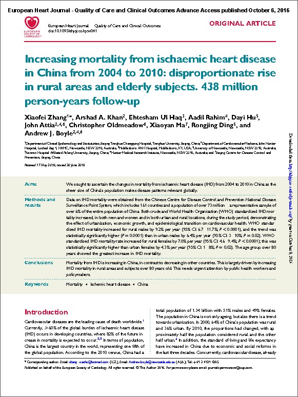 注:本文参考 《中国循环杂志》文章《欧洲心脏杂志子刊:中国每年冠心病死亡超100万人,农村居民增速远超城市居民》,及原文Xiaofei Zhang1*, Arshad A. Khan2, Ehtesham Ul Haq3, Aadil Rahim4, Dayi Hu5,John Attia2,4,6, Christopher Oldmeadow6, Xiaoyan Ma7, Rongjing Ding5, andAndrew J. Boyle2,4,6. Increasing mortality from ischaemic heart disease in China from 2004 to 2010: disproportionate rise in rural areas and elderly subjects. 438 million person-years follow-up. European Heart Journal—Quality of Care and Clinical Outcomes. 2017;3(1):47;