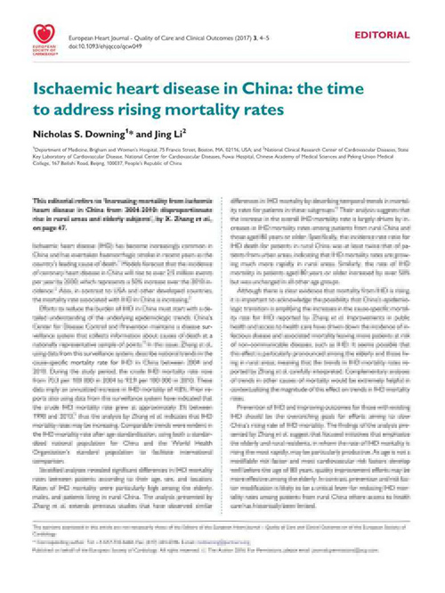 2. Nicholas S. Downing1* and Jing Li2. Ischaemic heart disease in China: the time to address rising mortality rates. 2017;3(1):4-5.