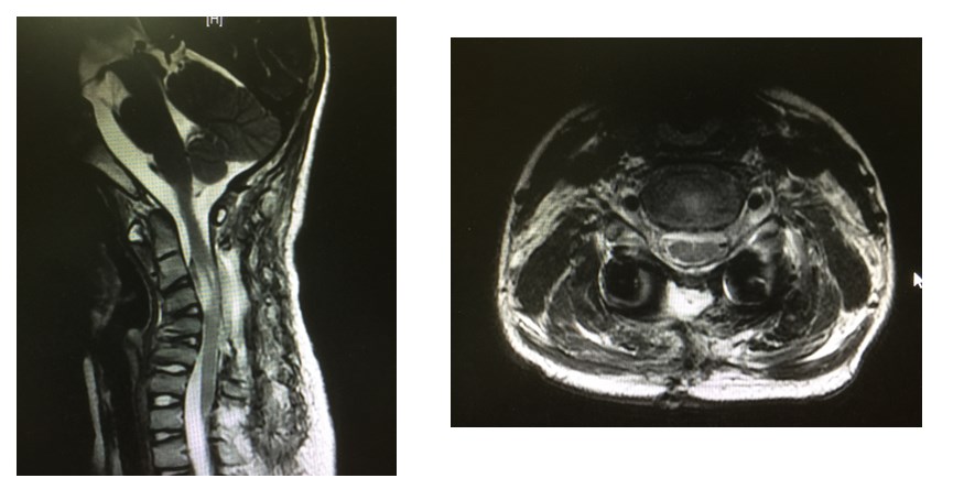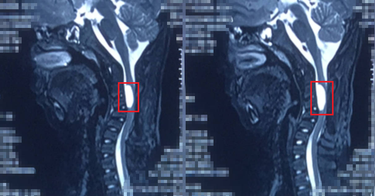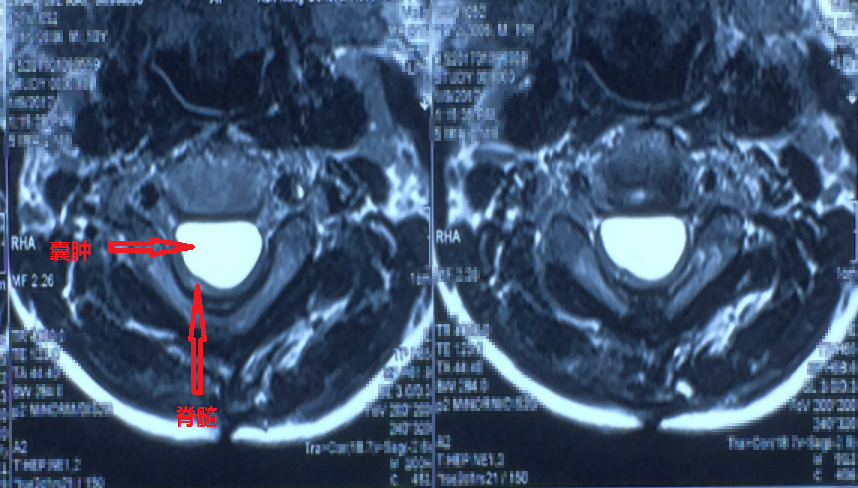来我院前复查,囊肿(红框内)仍然在,颈椎已出现严重的后凸(反曲)畸形,孩子四肢无力,上肢不能持物,下肢不能行走