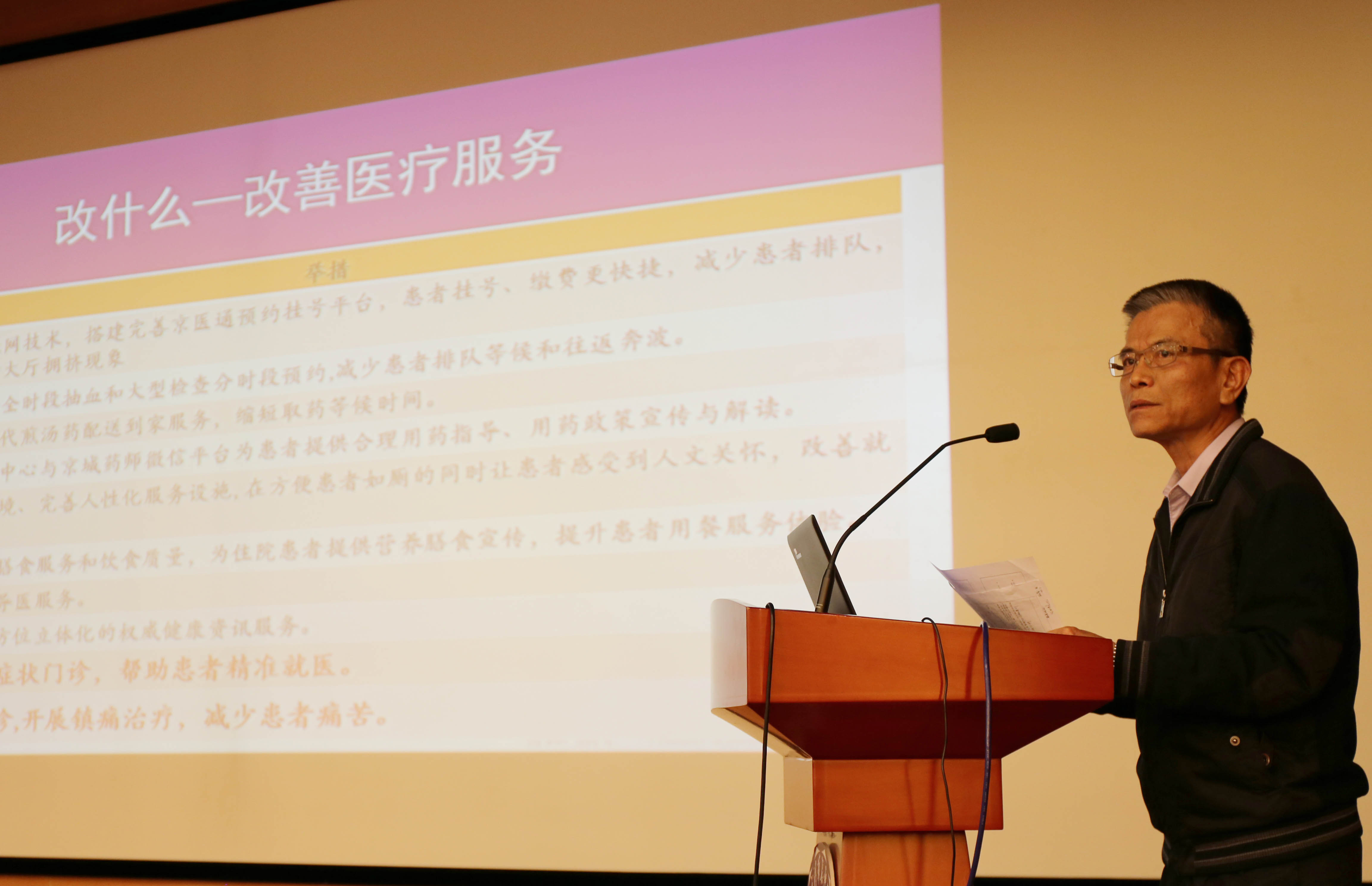 医政组组长何纪毅介绍了本次医改的具体内容,详细解读医改背景、范围、内容,尤其针对改革带来的医院信息系统、服务流程的改变,对一线医务人员进行宣导。同时,实施改革具有多项配套措施,覆盖到门诊、药品、护理等多方面,北京清华长庚医院围绕“以患者为核心”的服务理念,并按照北京市的要求,继续强化医疗服务,持续完善医疗服务项目。最后,何纪毅宣导了应急工作启动流程及处理方法,确保医改顺利进行。