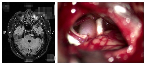3月初,朱大爷来到了北京清华长庚医院神经外科就诊,经磁共振检查发现,患者基底动脉压迫了左侧三叉神经根。结合患者的病情,王劲教授建议行微创的“三叉神经根显微血管减压术”,根治疼痛。22日,由王劲主刀,从耳后手术在颅骨上打开一元硬币大小的骨窗,打开硬脑膜,在显微镜下查找导致病变的“责任血管”,“多为动脉,如小脑上动脉、小脑下前动脉、基底动脉都可能造成神经压迫”王劲说。术中将血管游离开,再将特氟龙绵片置于脑干和血管之间,把血管垫开,避免压迫神经根,这是止痛的关键步骤。缝合硬脑膜后,用钛网补上颅骨,缝合切口,手术顺利结束,全程两小时左右,出血少。术后,效果立竿见影,“脸一点也不疼了”,朱大爷高兴地说。