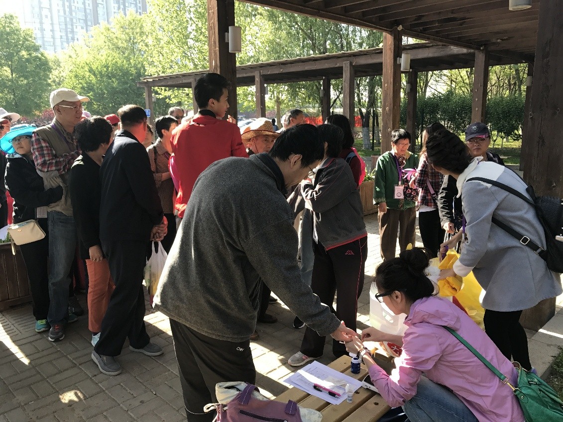 运动后,医务人员们在此为糖友测量血糖,加深运动可以降低血糖的印象,同时科普低血糖的处理方式。