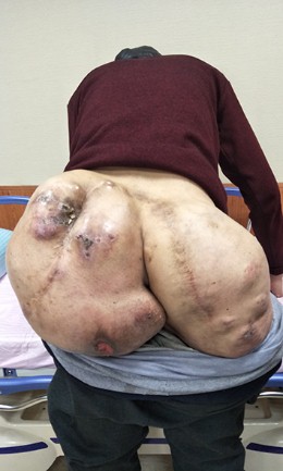 清华长庚医院5月10日电(神经外科荆林凯 祝永杰 邵婷婷)画面中的“巨臀”实际上是一颗发于骶骨的低恶度肿瘤——脊索瘤,切除的肿瘤重达26.3斤。这惨不忍睹的画面背后,是一个患者7次手术后肿瘤复发的心酸故事。因为消极应对,第8次肿瘤复发之巨大,患者被各处拒收,最终,由北京清华长庚医院神经外科主任王贵怀,联合泌尿外科、血管外科、胃肠外科、整形科、重症医学科、麻醉科、放疗科和呼吸内科等,多学科联手共同攻关,为患者实施手术。5月9日,患者顺利出院,此时,他不仅可以正常行走,睡觉可以平躺,平时也可以坐立了。