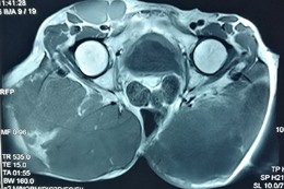 患者今年66岁,2005年检查出患骶骨脊索瘤。“这是一种发病率非常低的低度恶性肿瘤,复发率与肿瘤切除情况呈正相关关系。”王贵怀介绍。在当地医院进行了第一次手术,术后恢复良好,但好景不长,不到一年,肿瘤复发,且来势更凶。自此至2011年的6年时间里,患者反复接受了七次手术,肿瘤反复发作和屡次手术,给患者的身心造成了巨大的伤害。