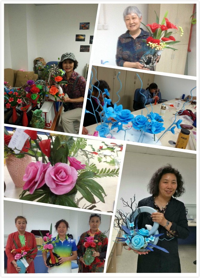 26个盆景,色彩缤纷、各有特色,凝聚了志工队手工组志愿者们近一个月的手工劳动。绢花盆景的制作需要经历缠铁丝、绷丝网、加垫片、整合花瓣、塑形、组合、整体设计等十多个环节,二十多位志愿者老师们边学边做,团队配合,为“扮靓护士节”的活动交上了完美的答卷。“总看见她们忙忙碌碌的工作,也总想为她们做点什么。希望我们亲手做的花朵可以装点护理站,也希望可以给白衣天使们带去温暖。”志愿者们这样说。