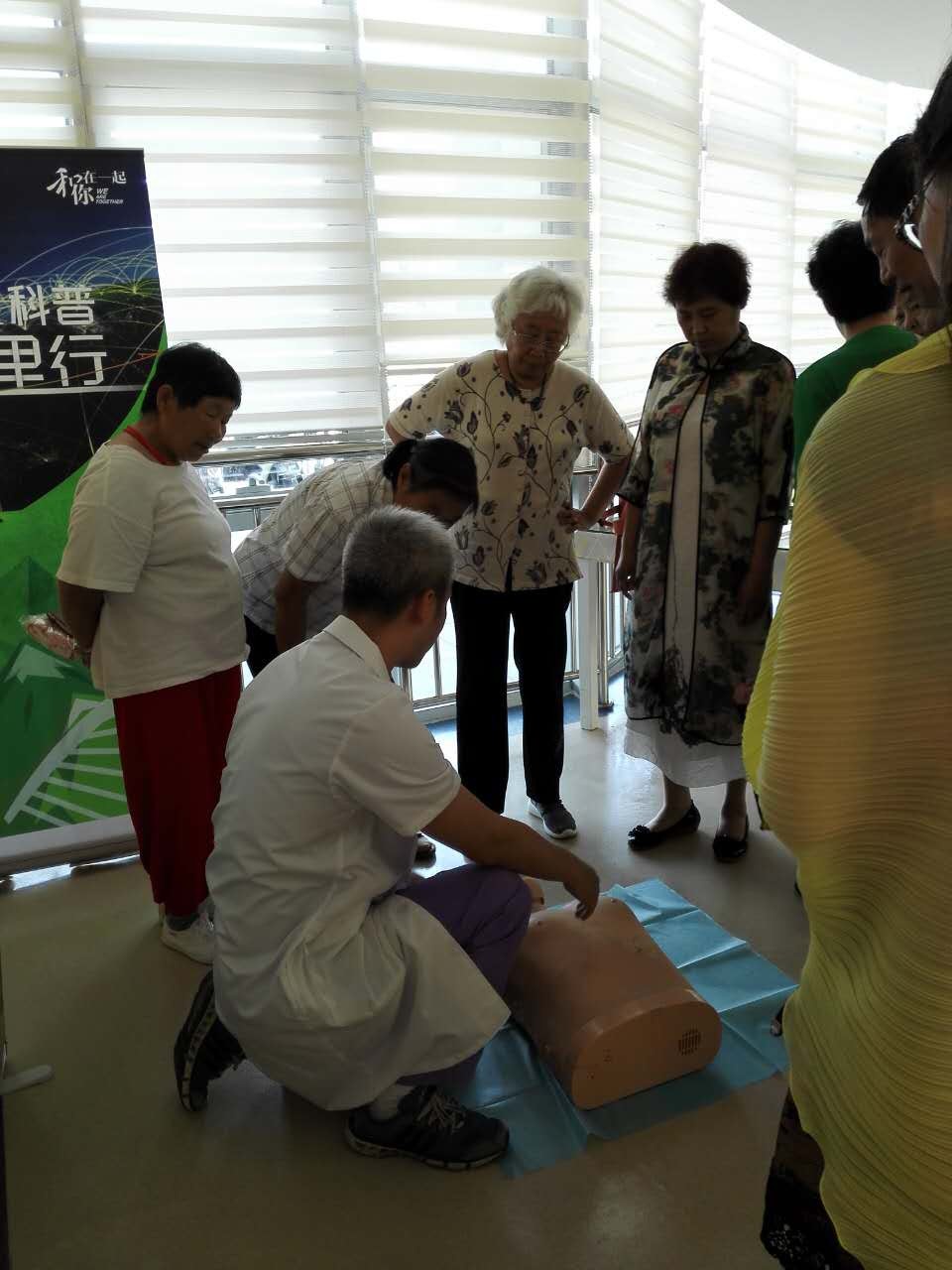 心脑血管病是社区内的高发疾病,遇到心肌梗死等急重症时,如何为家人争取有效的抢救时间,健康管理中心王非医师详细为居民们讲解如何在紧急情况下进行心肺复苏(CPCR)急救,从打急救电话,帮助调整体位、打开气道、判断呼吸到专业的胸外心脏按压等方法,逐步实践操作演练。