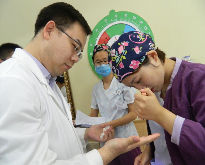 本次创意洗手比赛内容包括理论考核及操作考核两部分。理论考核采取了手卫生相关知识与多重耐药菌防控要点相结合的新的考核模式,操作考核也采取了别样的的更为直观的方式进行评估。首先由考官为选手的每一个手指做好荧光标记。接着选手取按照六步洗手法进行流动水洗手。考官对步骤、计时和选手手指上的荧光标记物去除程度进行打分。当考官用一个小小的手电查看被标记的手指时,未被清洗干净的部分发出醒目的紫色荧光,既能快速反映考核结果,同时也非常直观地提醒医务人员,未清洁好的手是病菌传播的最好途径。