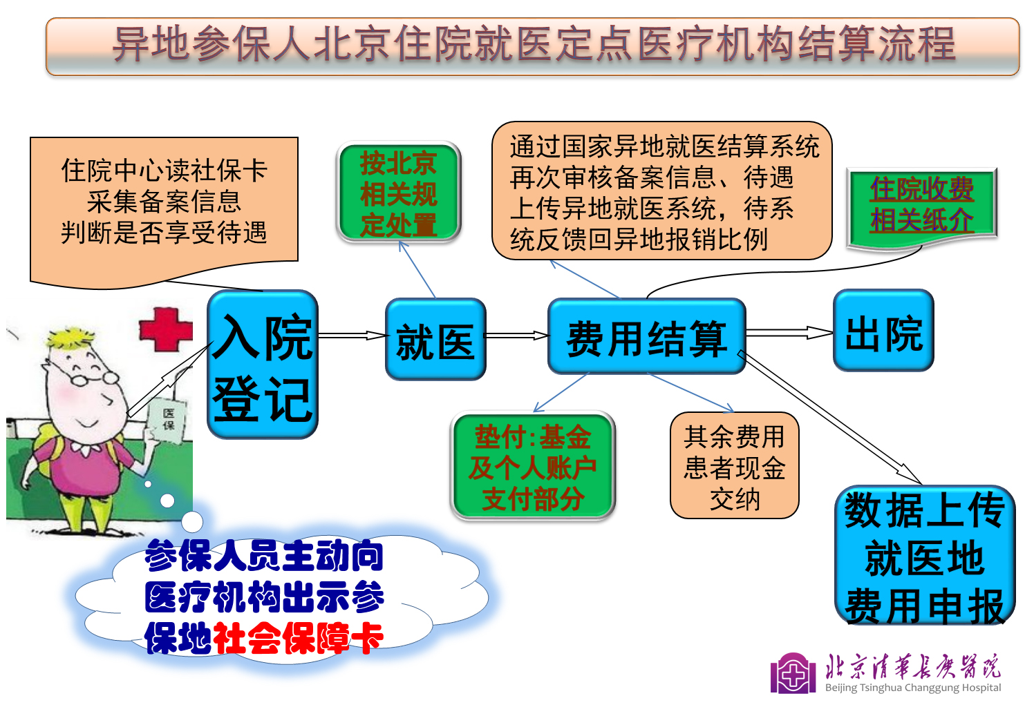据北京清华长庚医院医保办负责人聂广孟介绍,目前,患者出院后,北京清华长庚医院可在3个工作日后进行异地医保直接结算,考虑患者的实际情况,可为部分特殊患者开通出院当日结算的绿色通道。外地医保患者在京直接结算住院费用时,按北京市基本医疗保险支付范围,执行北京市药品目录、诊疗项目和医疗服务设施范围及其支付标准;而医保基金起付标准、支付比例、最高支付限额等,按患者所在参保地的相关政策执行。