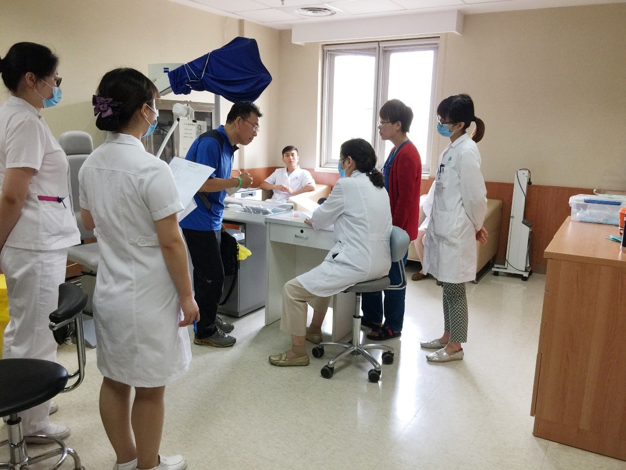 一大早,我换上了医务工作服,在院办同事的带领下,参观了耳鼻喉科室的布局,了解了每个房间及每项设备的用途,没有我印象里医院人声嘈杂,一切都那么安静、舒适,那么井然有序。在参观期间,正巧碰到了耳鼻喉科叶主任,原来叶主任一早就来到科室准备开始一天的工作。我跟着叶主任来到了耳鼻喉治疗室,治疗室里的其他医生都已严阵以待,时刻为每位患者的健康准备着。