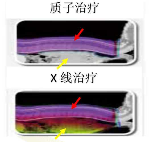 图中红色箭头所指为治疗区域,黄色箭头所指为正常组织,有颜色的区域代表接收到放射剂量的组织