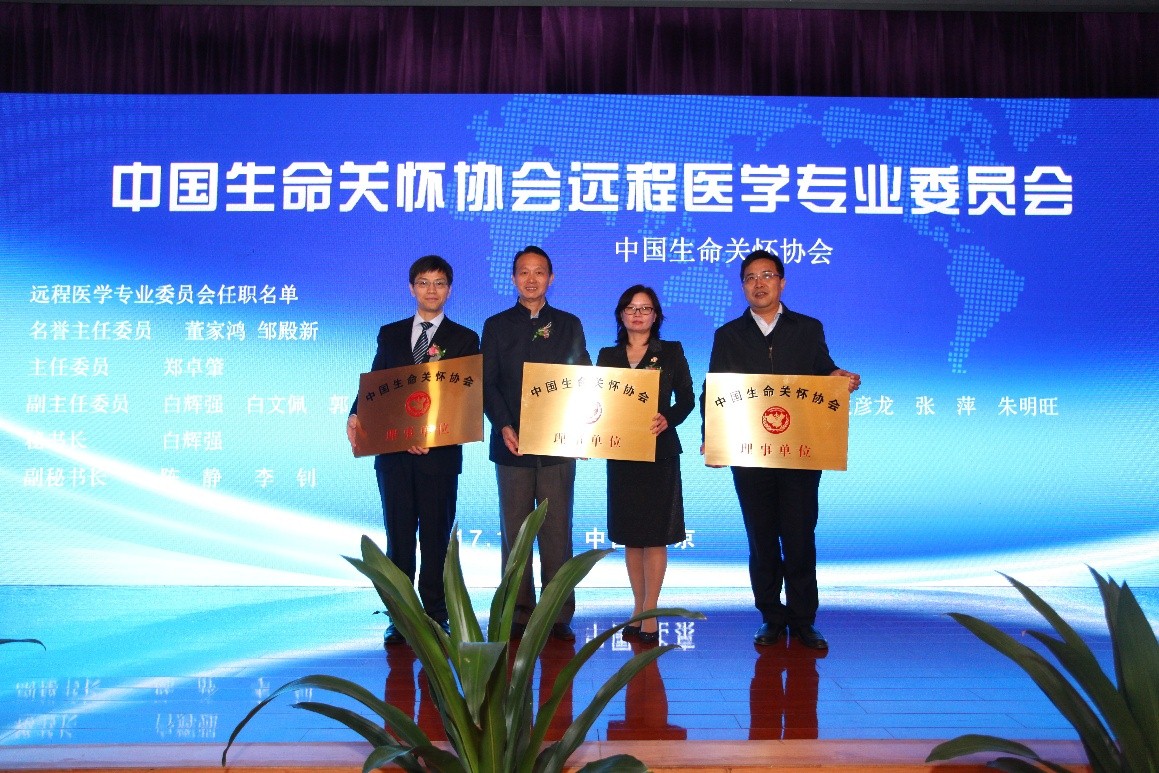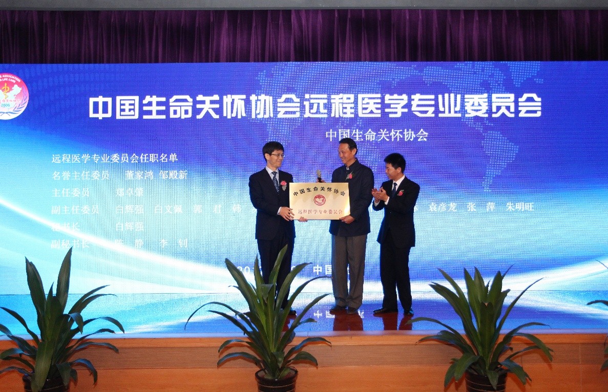 图为中国生命关怀协会为远程医学专业委员会授牌(左为郑卓肇,中为李建华)