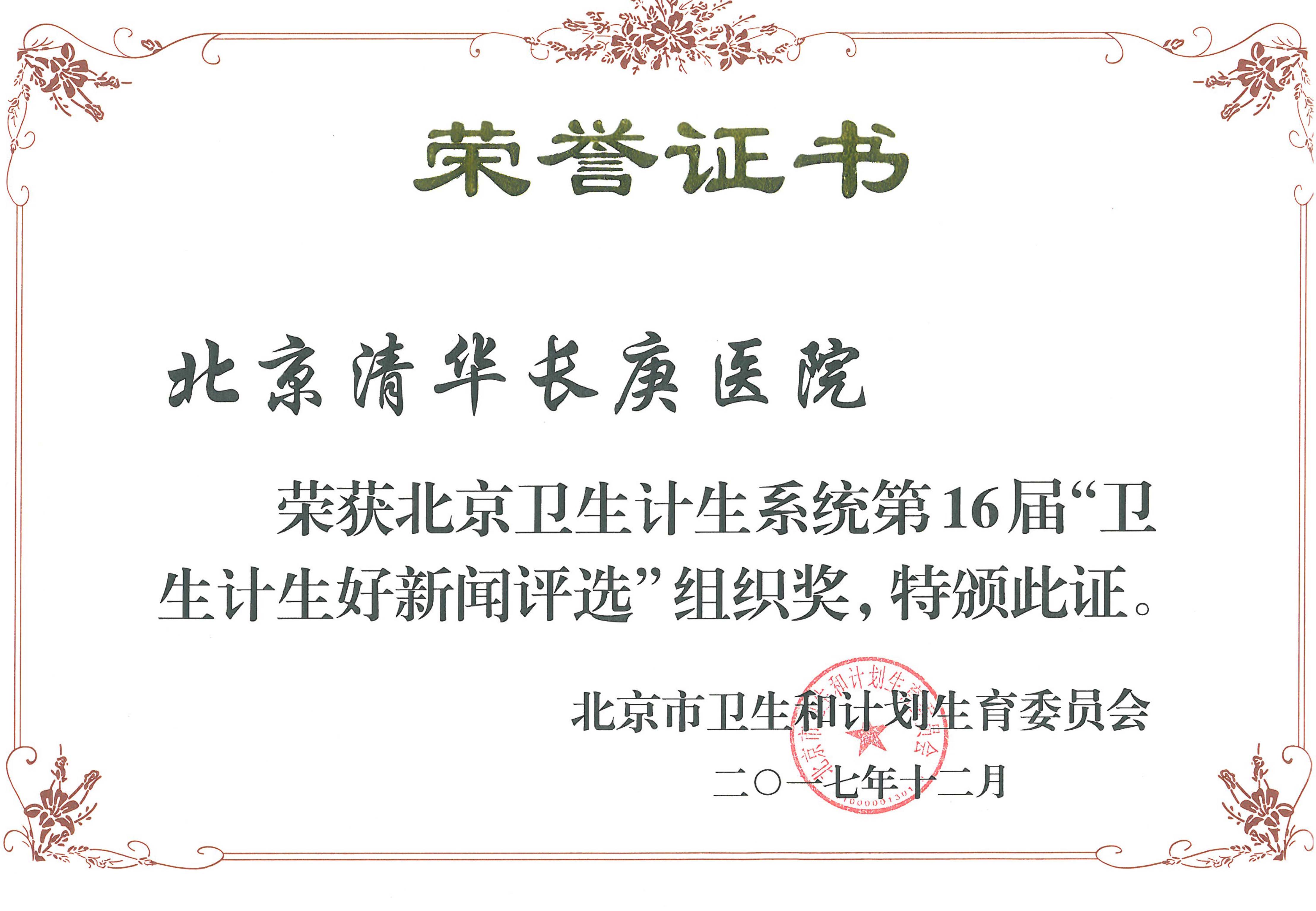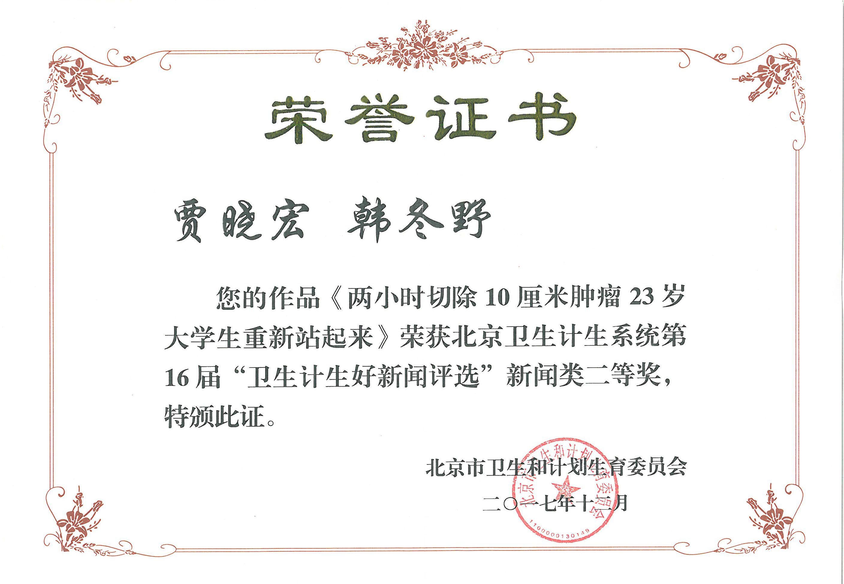 在北京卫生计生系统第16届“卫生计生好新闻评选”中,我院荣获十佳组织奖,7篇新闻与科普作品获奖。在北京卫生计生系统第四届“优秀院报评选活动”中,我院获三级医院组十佳院报奖以及十佳版面设计奖。北京卫生计生系统第26届“杏林杯”电视片评选中,我院参赛作品《生命的挑战》获专题片三等奖。