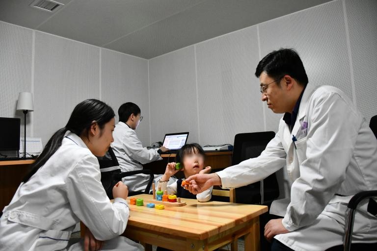 图为耳鼻咽喉头颈外科医师与听力技师为植入人工耳蜗的患儿进行术后调机(侯建鹏 摄)