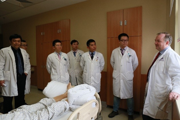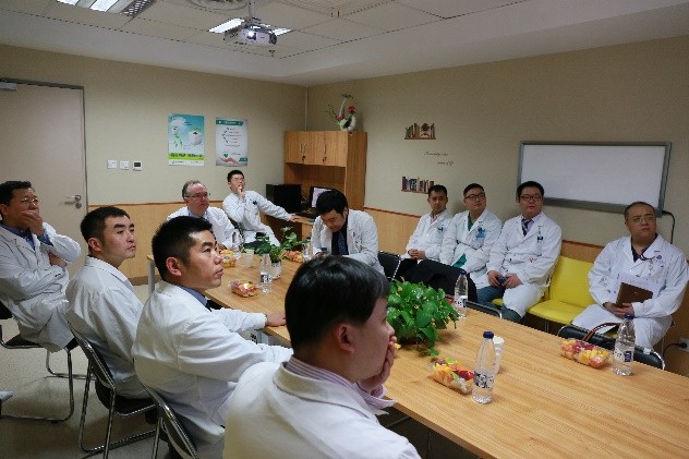 演讲结束后,肝胆外科副主任医师韩东冬等陪同Millis教授来到肝移植病区,进行教学查房和病例讨论。肝硬化、肝功能衰竭、肝脏肿瘤等是造成这些患者进行肝移植的主要原因,肝胆外科医师李昂、杨世伟、张新静和于里涵汇报了相关病情。Millis教授对肝脏移植中心的迅速发展和患者术后顺利恢复表示祝贺。