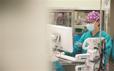 手术过程中,马燕利时刻留意患者身体的各项体征数据。