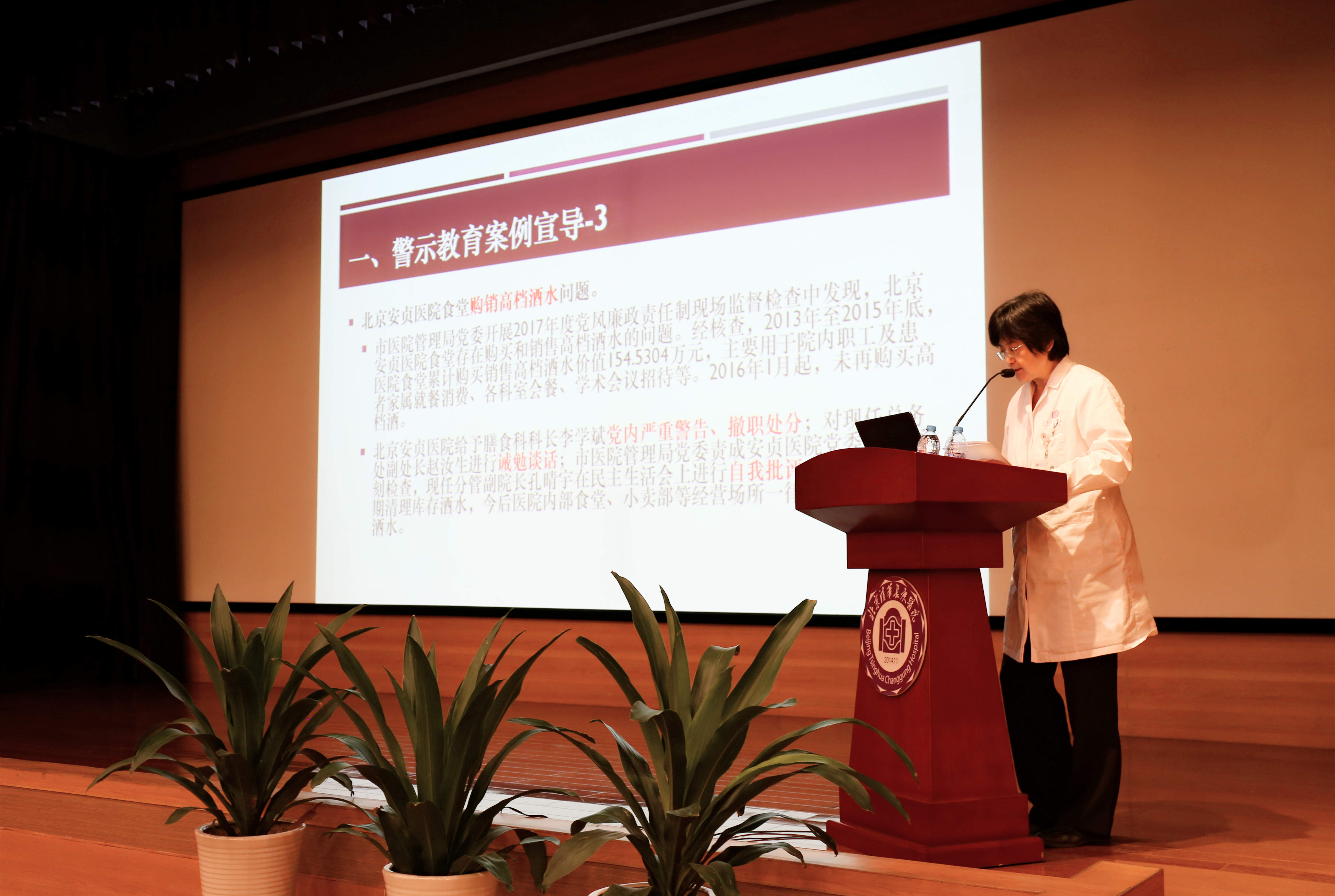 陈旭岩通报了北京市4起卫生计生领域违反中央八项规定精神典型问题,以及清华大学全面从严治党工作会议警示教育通报。她希望全院党员干部切实增强纪律意识、责任意识,从中汲取深刻教训,不断改进作风,加强党性修养。院纪委将切实履行监督责任,用好监督执纪四种形态,持之以恒正风肃纪,防微杜渐,协助党委推进全面从严治党向纵深发展,为医院的建设与发展提供坚强保障。会上还通报了医院2018年度纪检监察工作总体要求和工作要点。
