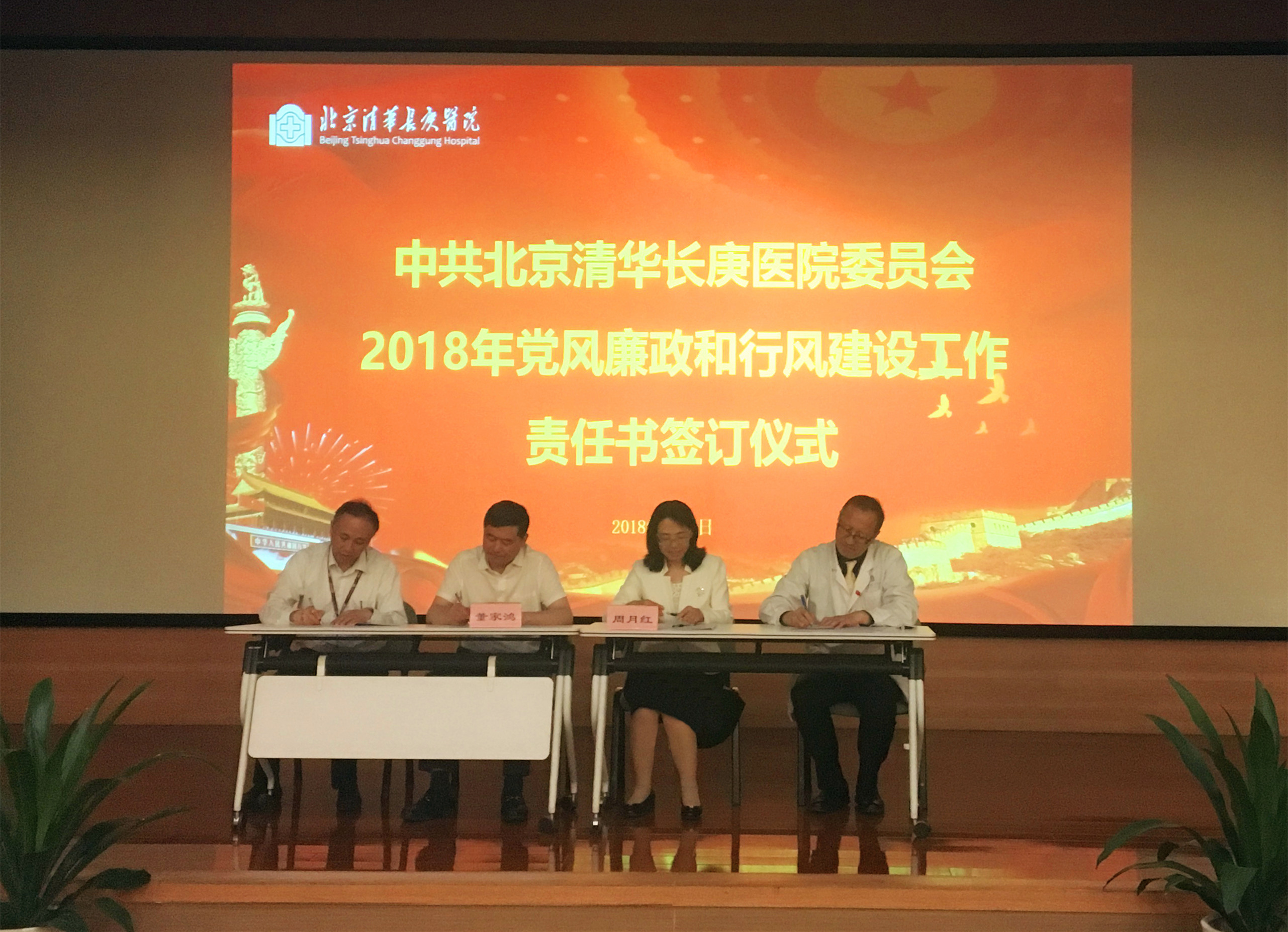 会上,周月红书记、董家鸿院长与科室主任、行政主管代表共同签署了《中共北京清华长庚医院委员会2018年党风廉政和行风建设工作责任书》。