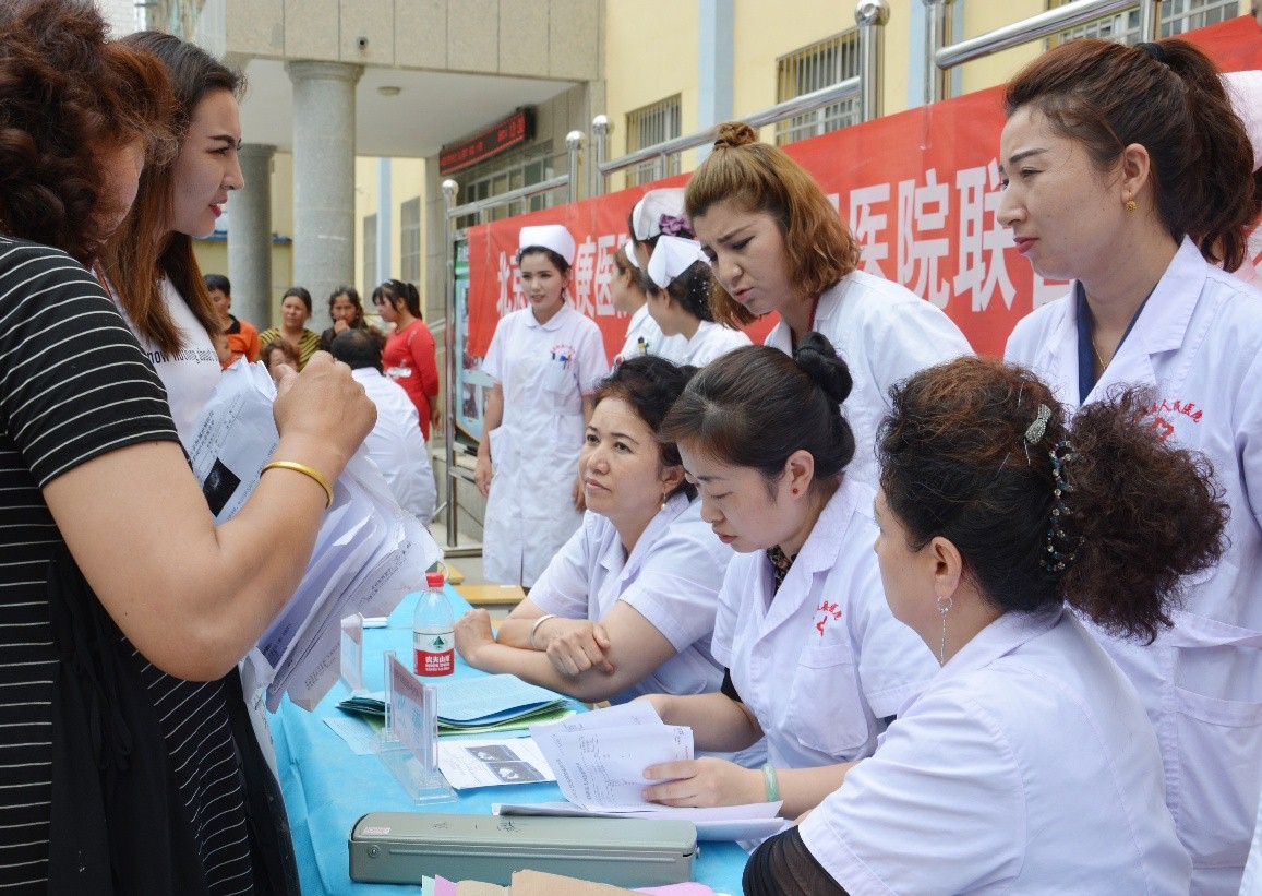 图为北京清华长庚医院联合麦盖提县人民医院为当地居民义诊