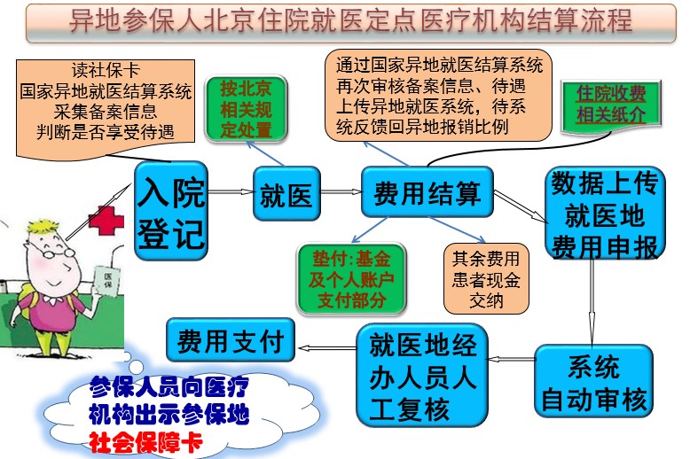 外地医保患者在京直接结算住院费用时,按北京市基本医疗保险支付范围,执行北京市药品目录、诊疗项目和医疗服务设施范围及其支付标准;而医保基金起付标准、支付比例、最高支付限额等,按患者所在参保地的相关政策执行。