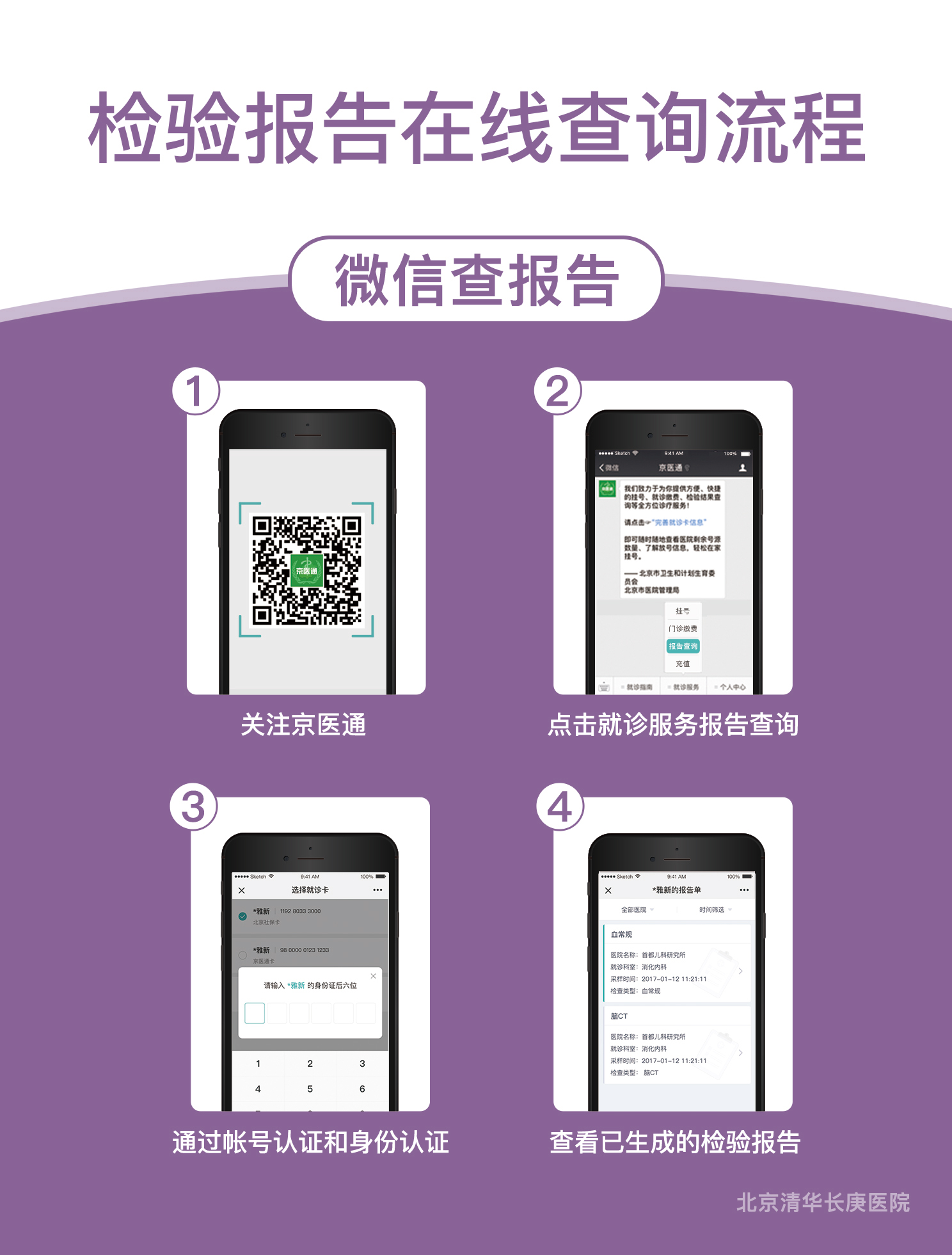 患者只需关注“京医通”微信公众号,在页面下方选择“就诊服务报告查询”,绑定社保卡或京医通卡,通过账号认证和身份认证后,即可查看已经生成的检验报告结果。