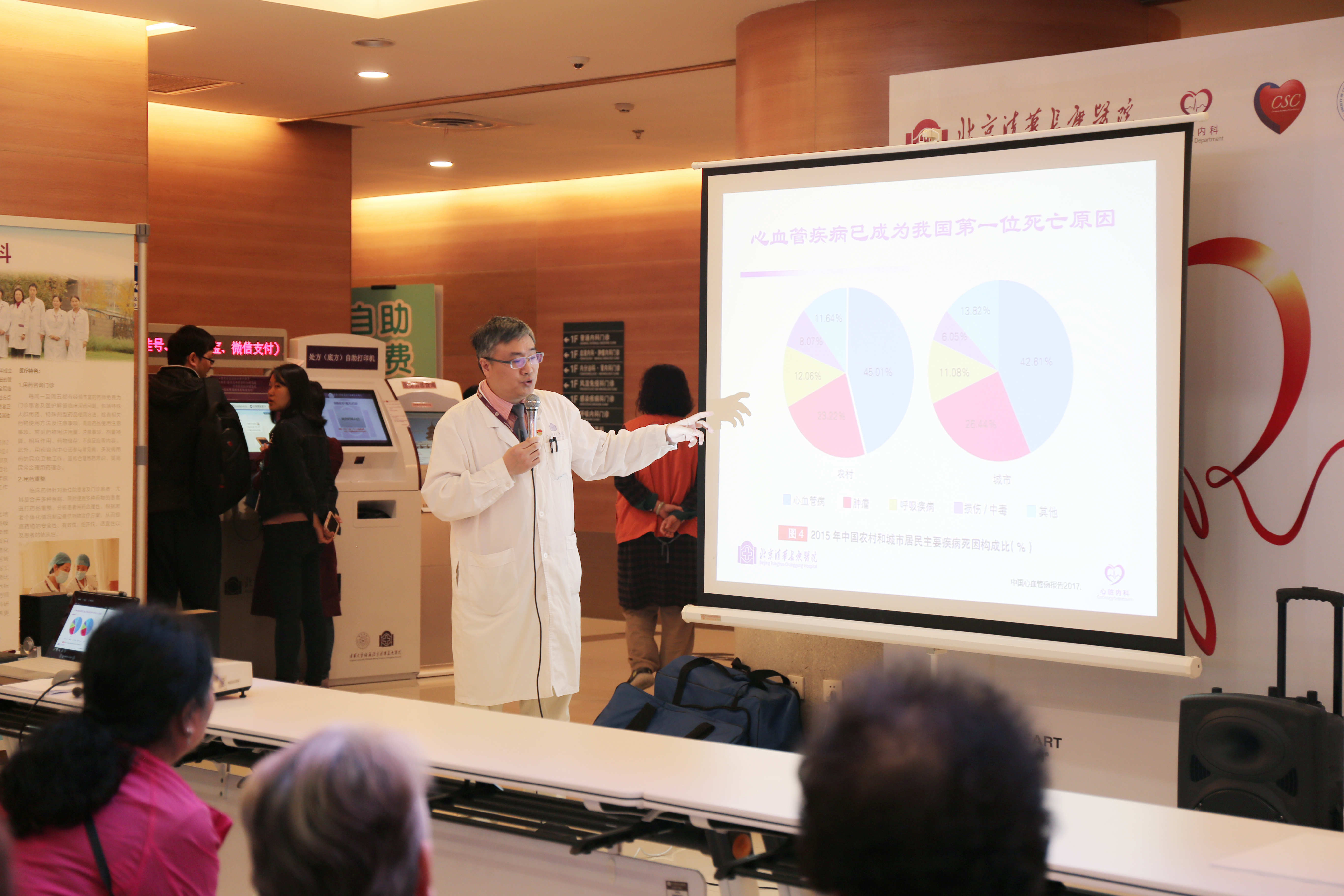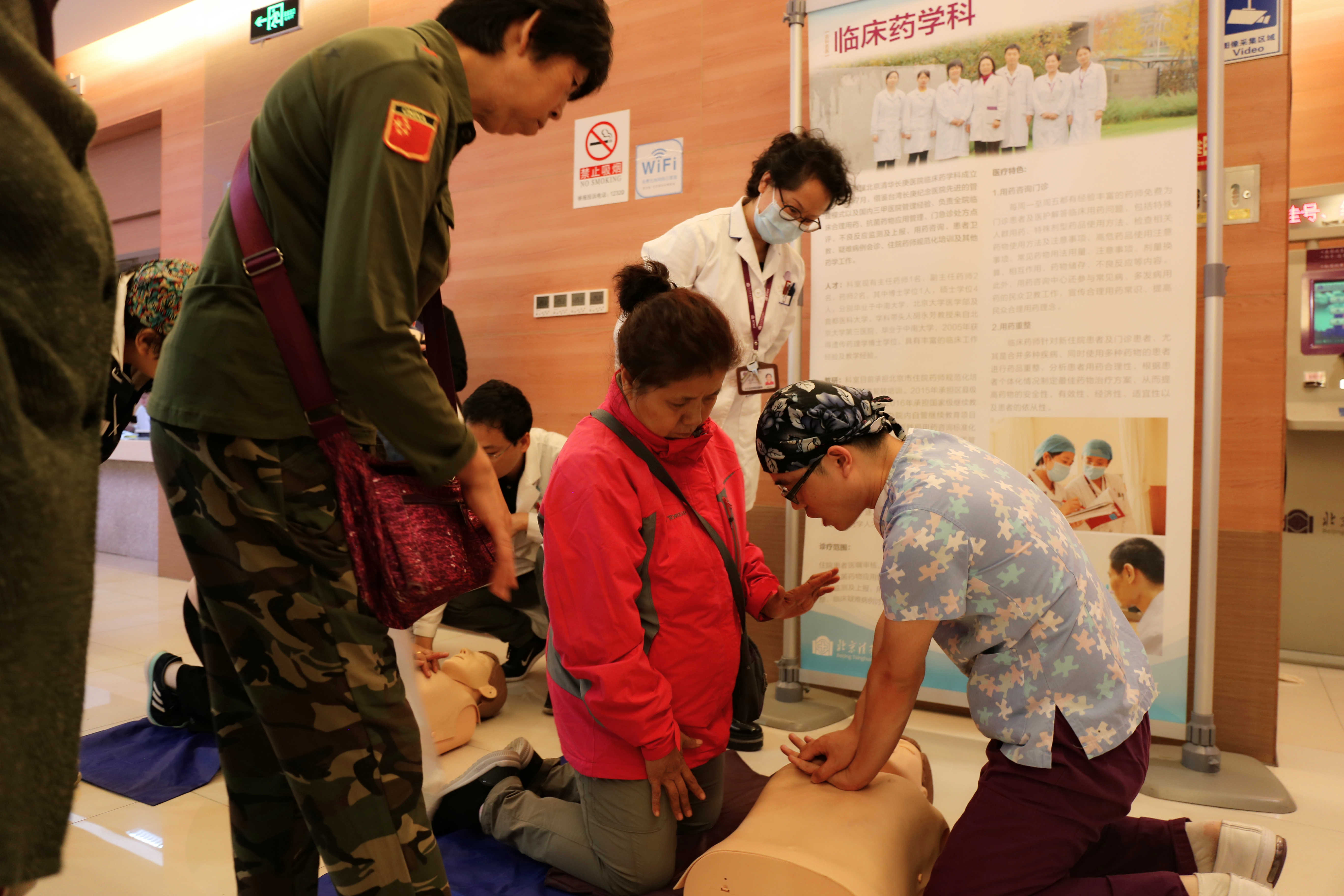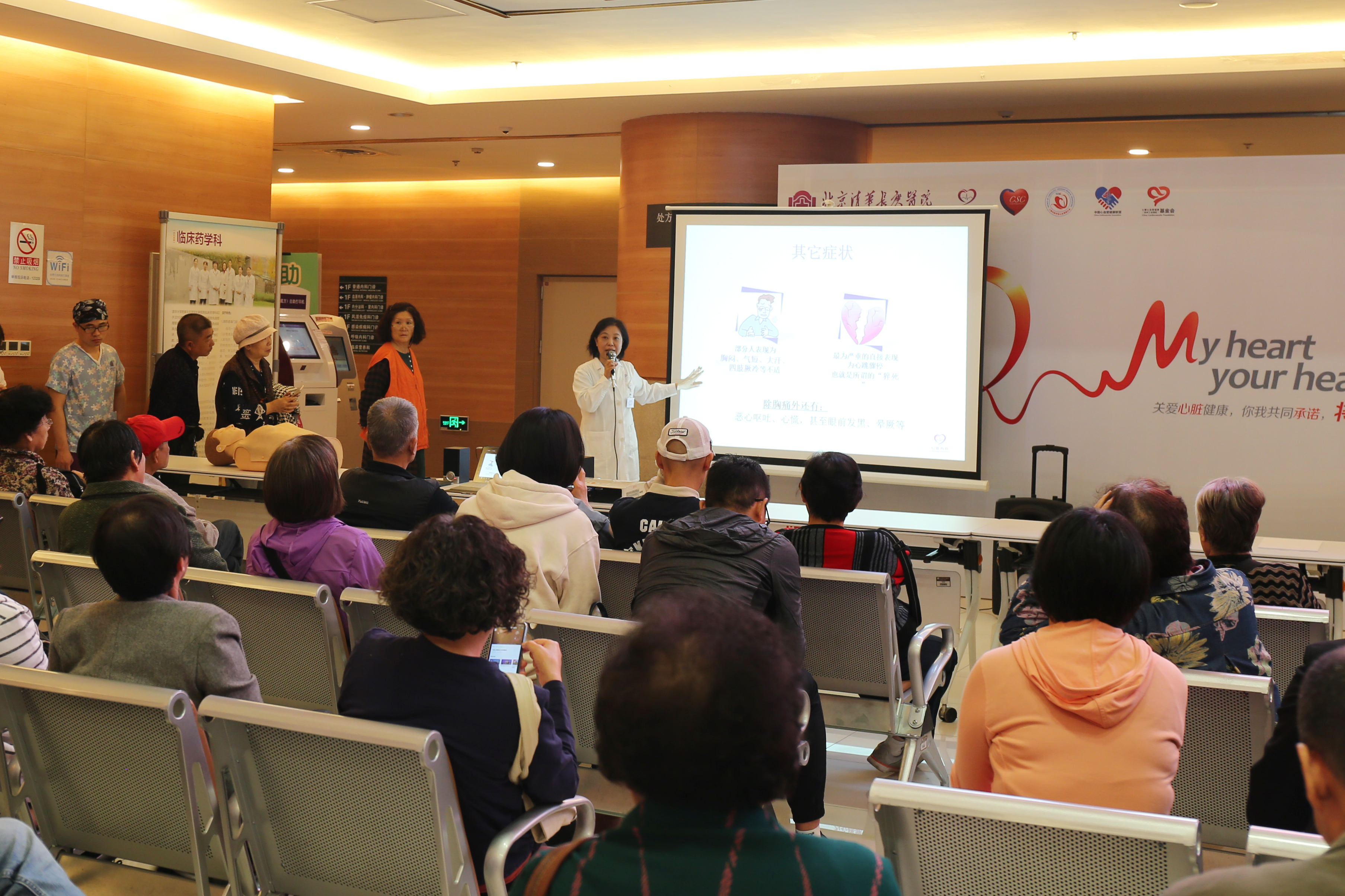 张鸥医师向患者讲解和演示了成人心肺复苏的要点,并由清华长庚医院的医生们指导有兴趣的患者进行了现场操作。第一步,呼叫病人,确认病人是否有意识;第二步,向就近的人员呼救,包括呼叫急救车,拿除颤仪等;第三步,判断病人是否有颈动脉搏动;第四步,进行胸外心脏按压,按压频率每分钟100-120次;第五步,30次心脏按压后进行2次口对口人工呼吸;第六步,持续2分钟后(约5个循环),再次判断患者的意识。学会如何判定心脏骤停以及如何进行徒手心肺复苏,可以第一时间对身边的朋友及亲人进行抢救,提高他们的生存率。