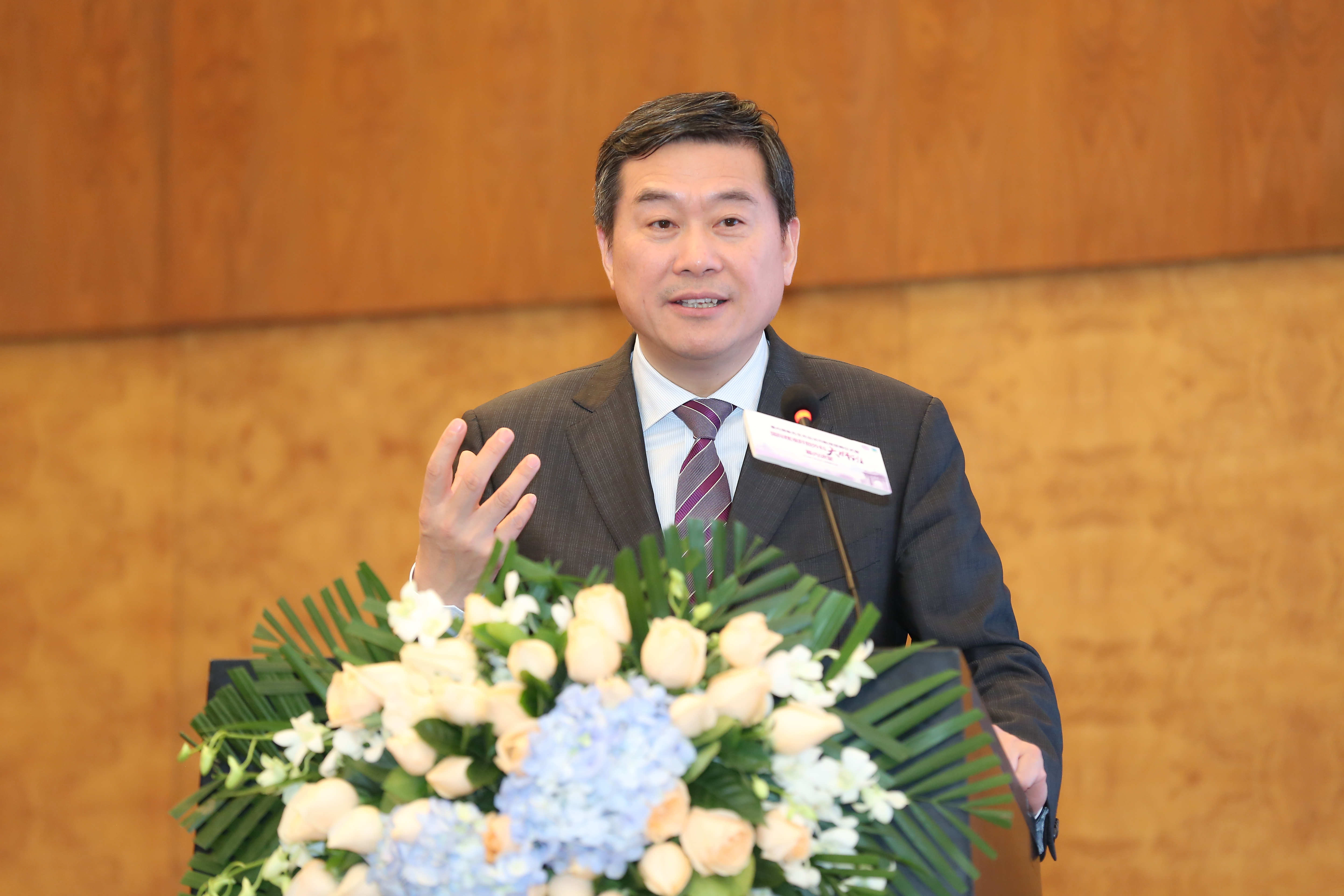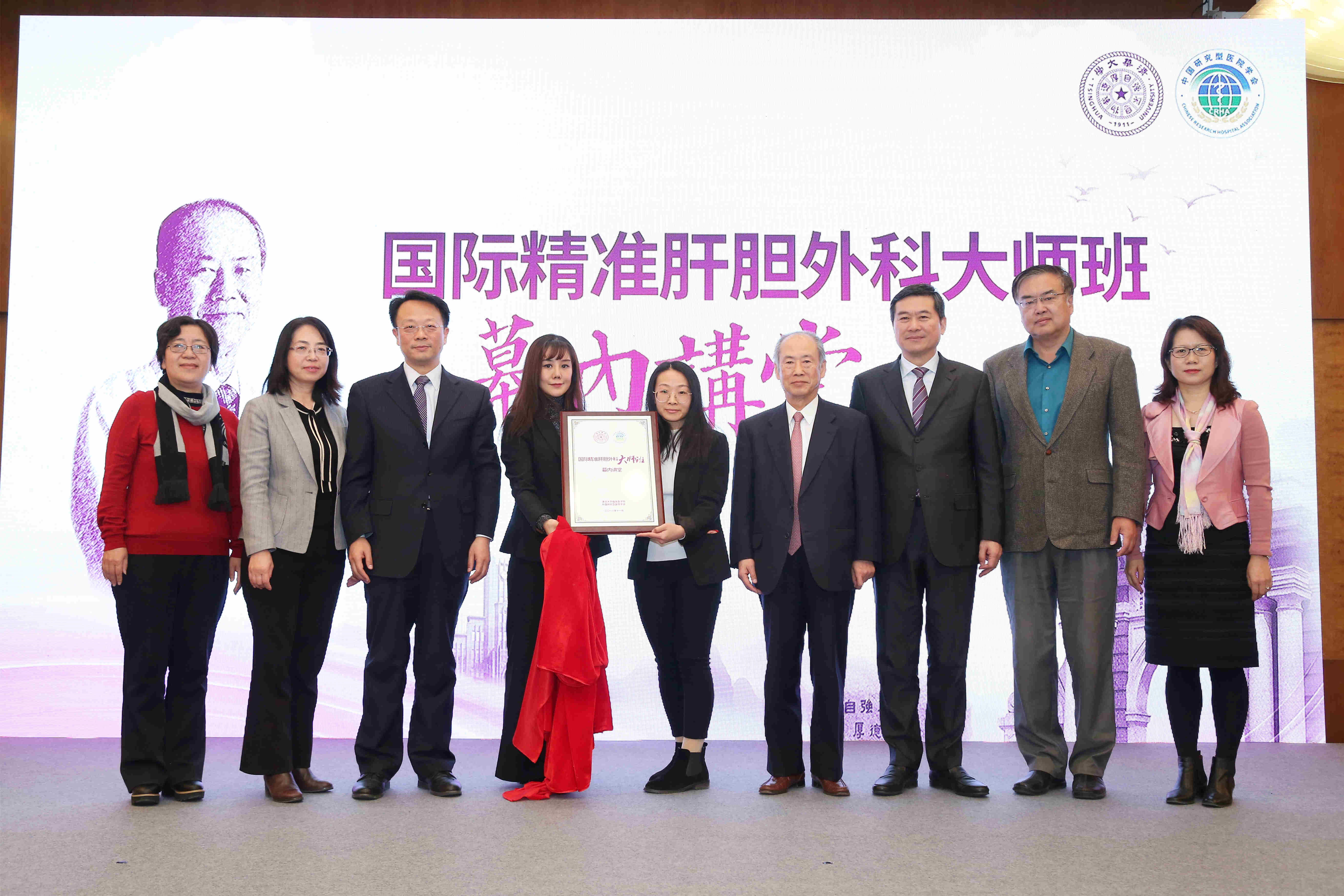 清华大学常务副校长王希勤、清华长庚医院执行院长董家鸿、党委书记周月红、副院长王劲、党委副书记王克霞、清华大学临床医学院副院长高彦芳等共同为国际精准肝胆外科大师班幕内讲堂揭牌。