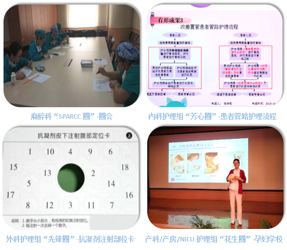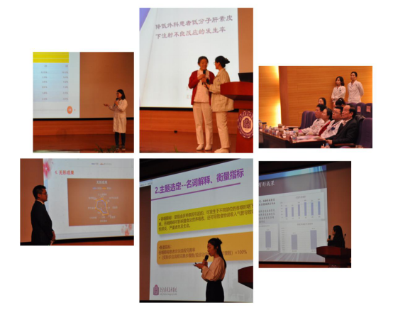 中间部分是4个护理主题品管圈。来自麻醉科的“SPARCC圈”开展的“降低术后低体温发生率”活动将术后低体温发生率降低至2.19%,并能持续保持成效。来自内科护理组的“芳心圈”展示了“降低内科病房非计划性拔管发生率”的活动成果,改善后内科病房非计划拔管发生率下降至0.254‰,进步率58.2%。来自外科护理组的“先锋圈”展示了“降低外科患者低分子肝素皮下注射不良反应的发生率”的活动成果,手法运用规范、改善措施效果显著。来自产科、产房、NICU护理组的“花生圈”展示了“提高产妇出院时全母乳喂养率”的活动成果,改善后全母乳喂养率上升一倍、达到44.4%。