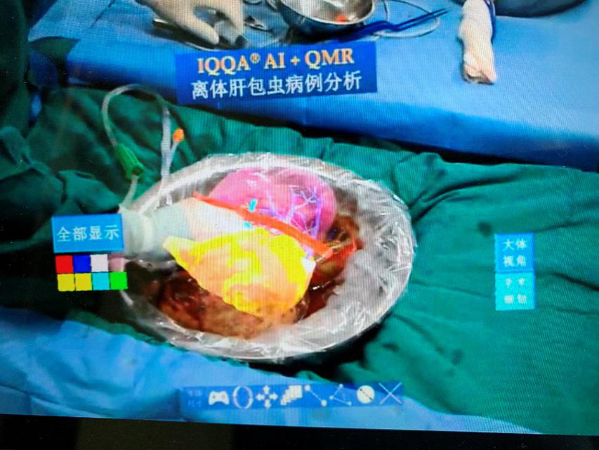 肝脏切除离体后,没有办法对“虫癌”边界和肝脏切割平面的血管进行“超声定位”。主刀医师董家鸿教授、卢倩主任亮出“武器”——混合现实(MR)技术,王学栋医师、汤睿医师和工程技术人员将术前的三维重建图形与术中离体后的肝脏进行配准重叠,直接透视肝脏,清晰呈现肝脏内部血管及病灶结构,在计算机合成影像的精准导航下,医师从容手术。切除“虫癌”重达2.3kg,剩余健康肝脏约为1kg,与术前估测完全一致,能够充分满足患者术后恢复及健康生活需求。