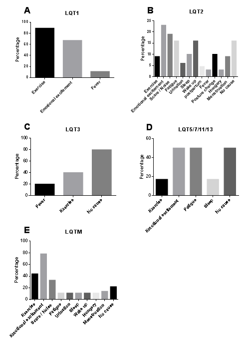 不同亚型的LQTS患者心脏事件发病诱因不同。LQT1患者主要于运动或应激时发生(99%)。LQT2患者发病诱因相对多样,包括情绪激动(23%)、声音刺激(19%)、唤醒(16%)、劳累(16%)、排尿(6%)、发热(3%)、饥饿(3%)、体位改变(10%),女性患者中心脏事件部分于月经(9%)、产后(4.5%)发生。LQT3患者主要于静息状态和睡眠时发病。生存分析表明LQTM患者预后相对较差。