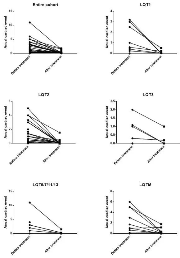 治疗方面,51例(59%)患者使用β受体阻滞剂治疗。在平均随访7.14±3.12年期间,患者药物治疗后年平均心脏事件负荷较治疗前显著降低(1.29±1.83 vs. 0.16±0.36,P<0.0001)。