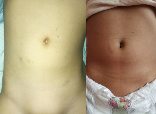 图为腹腔镜下疝修补术后患儿的腹部情况