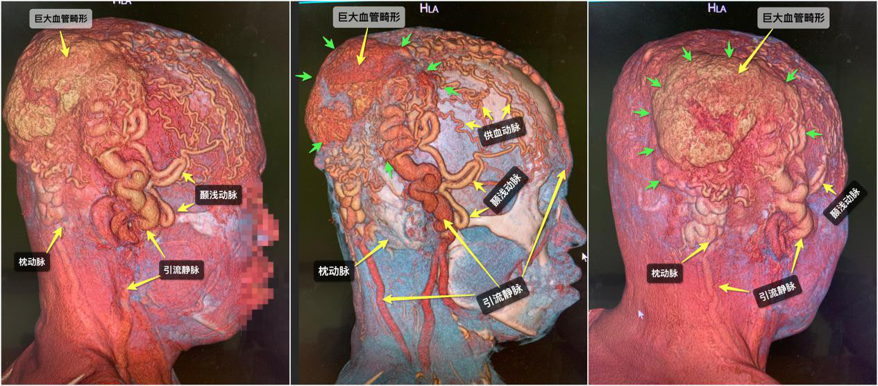 反复诊察患处,郭毅陷入思索:如果进行手术切除,如此巨大的头皮血管瘤,动脉与静脉交汇往复,每一步稍有不慎就是大出血,患者、家属、医生都将承担巨大风险;与著名介入专家姜除寒教授反复讨论该病例后,考虑如果不进行手术切除,介入或姑息治疗可以解一时之忧,但定时炸弹并未拆除,何况一旦发生介入后远隔部位栓塞,仍然会危及患者性命。看向患者和家属迫切期盼的眼神,郭毅决定将患者收住院进行治疗。