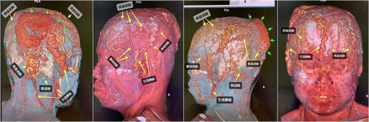 张先生出生时右顶枕头皮就有一块“胎记”,几十年来逐渐长大,并且表面反复溃破,种种反常让他起了疑心。这究竟是不是普通的胎记?当地医院通过血管造影(DSA)诊断为头皮巨大血管瘤,并且分两次结扎左侧颞浅动脉、左侧枕动脉和右侧颈外动脉,随后额部引流静脉缩小。但是由于具有十分高的大出血风险,医院并未给出具体解决方案,张先生也没有做进一步处理。