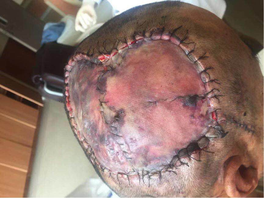 两次前期手术后,张先生反应良好,郭毅医师暂时放下了一半的心,行血管造影DSA检查再次排除和脑内循环交通,确定可以进行切除手术。经与整形外科杨建民主任团队多次讨论,确定最后一次的手术方案为:切除头皮血管瘤及枕部皮下血管畸形团,一期取中厚皮片植皮。手术不仅需要切除血管瘤,还有大量的皮下畸形血管团,除了防止粗大血管出血风险,还要注意细小血管团大量渗血的可能。取下瘤体后,由于缺损创面很大,封闭时需要移植背部皮肤,与患者不正常的皮下组织进行融合。