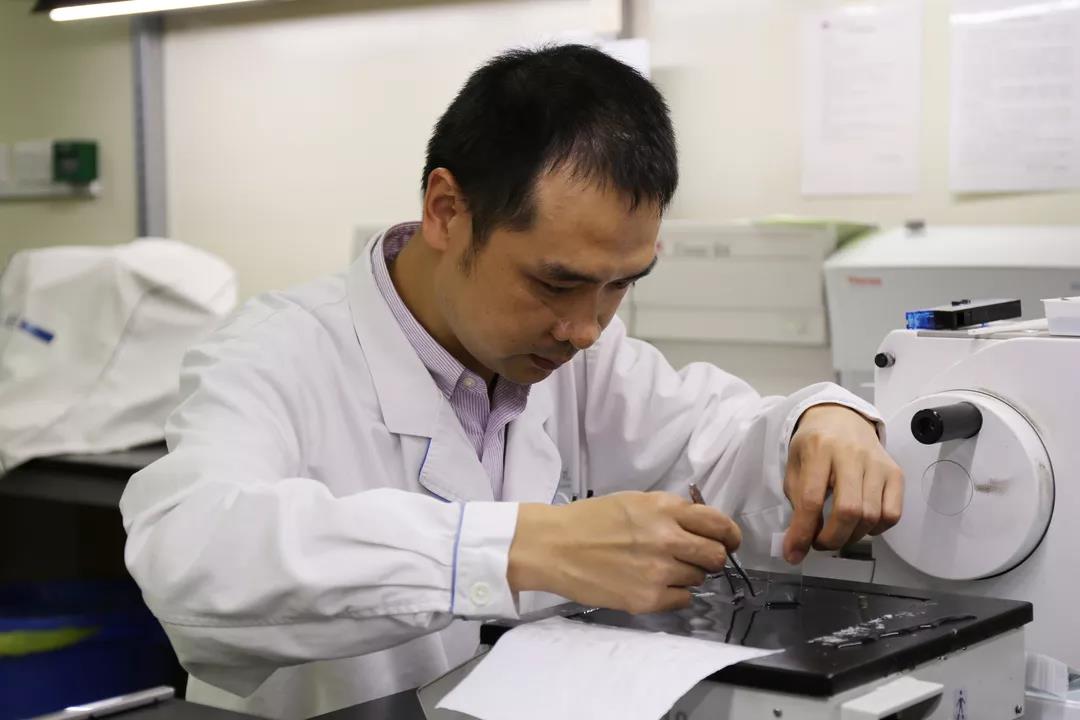 辉哥从事病理技术工作已经10多年了,刚参加工作的时候,大家都很保守,不会轻易把自己的技术和经验传授给别人。那时标本很少,给新手锻炼的机会很难得,而病理技术又是极其讲究实际操作经验的,大量的演练和操作才能磨炼出真正技艺。那时的他学习特别艰辛,吃了不少苦头。不过,这些苦恰恰让辉哥明白了掌握一门技术的重要性,他不断精进自己的技艺,像“艺术家”一样精雕细琢、精益求精每一件“作品”。