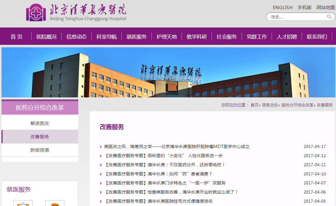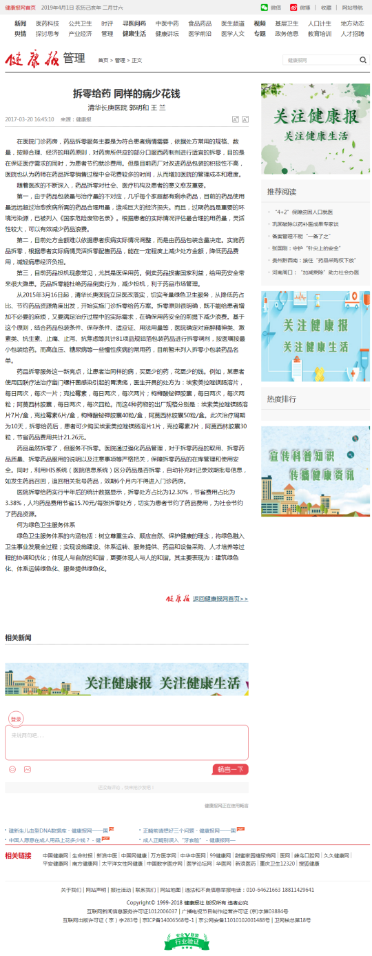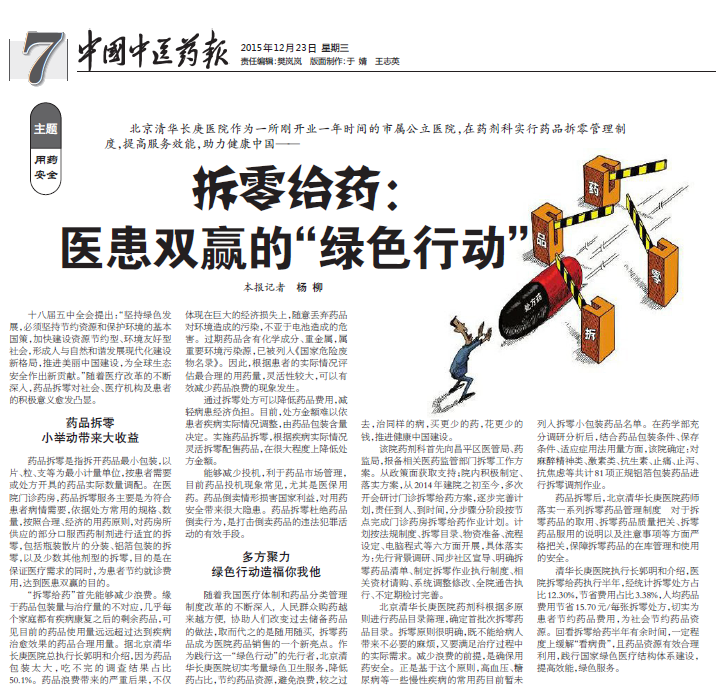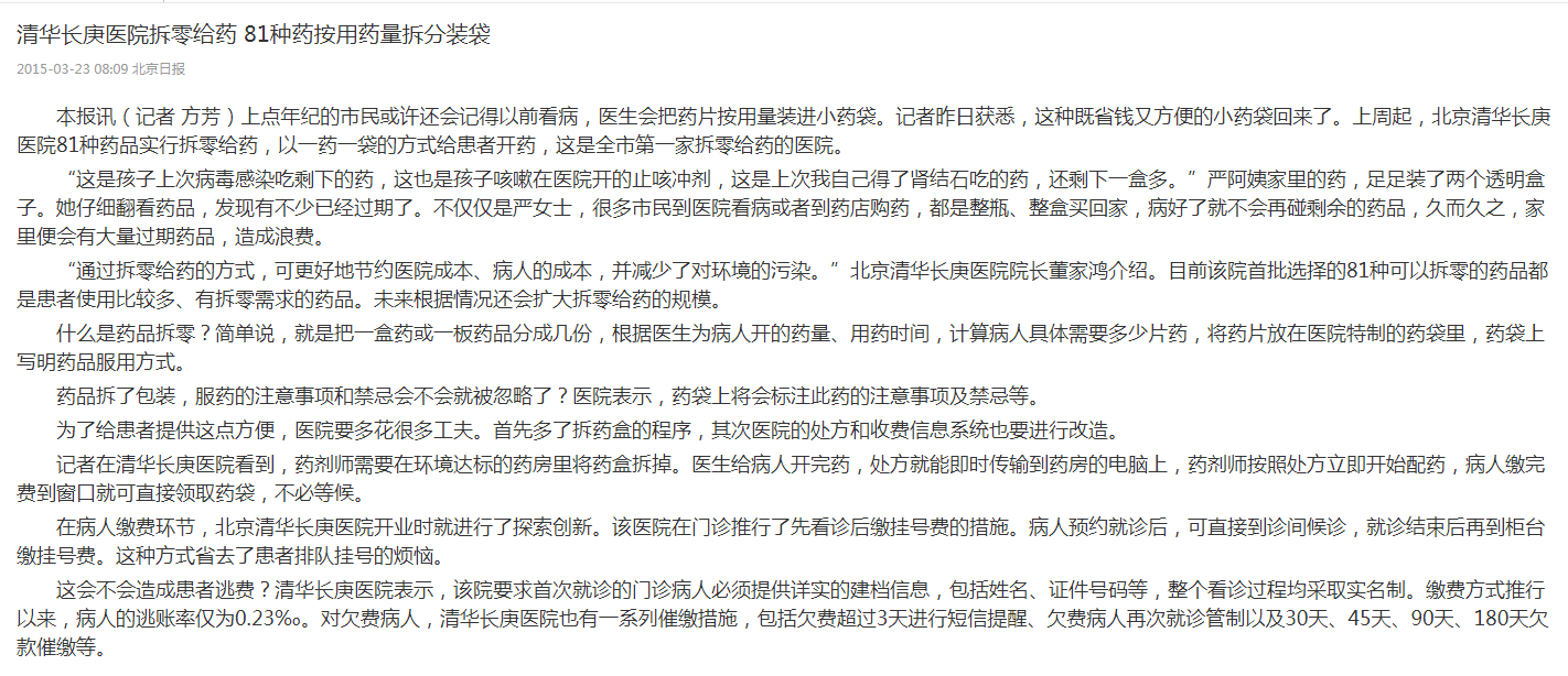 2017年4月8日,北京市正式推出医药分开综合改革,北京清华长庚医院抓住“药品阳光采购”这一有利时机,再次对“拆零给药”进行了新闻宣传,主题定位为——不仅医药分开,还拆零给药,进行了一轮广泛的宣传推广。在《健康报》管理版发表专版文章;
