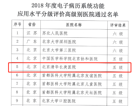 北京清华长庚医院6月11日电(通讯员 李强)6月10日国家卫生健康委医院管理研究所网站公布了“2018年度电子病历系统功能应用水平分级评价高级别医院通过名单”,北京清华长庚医院通过五级评审,进入全国前1%。