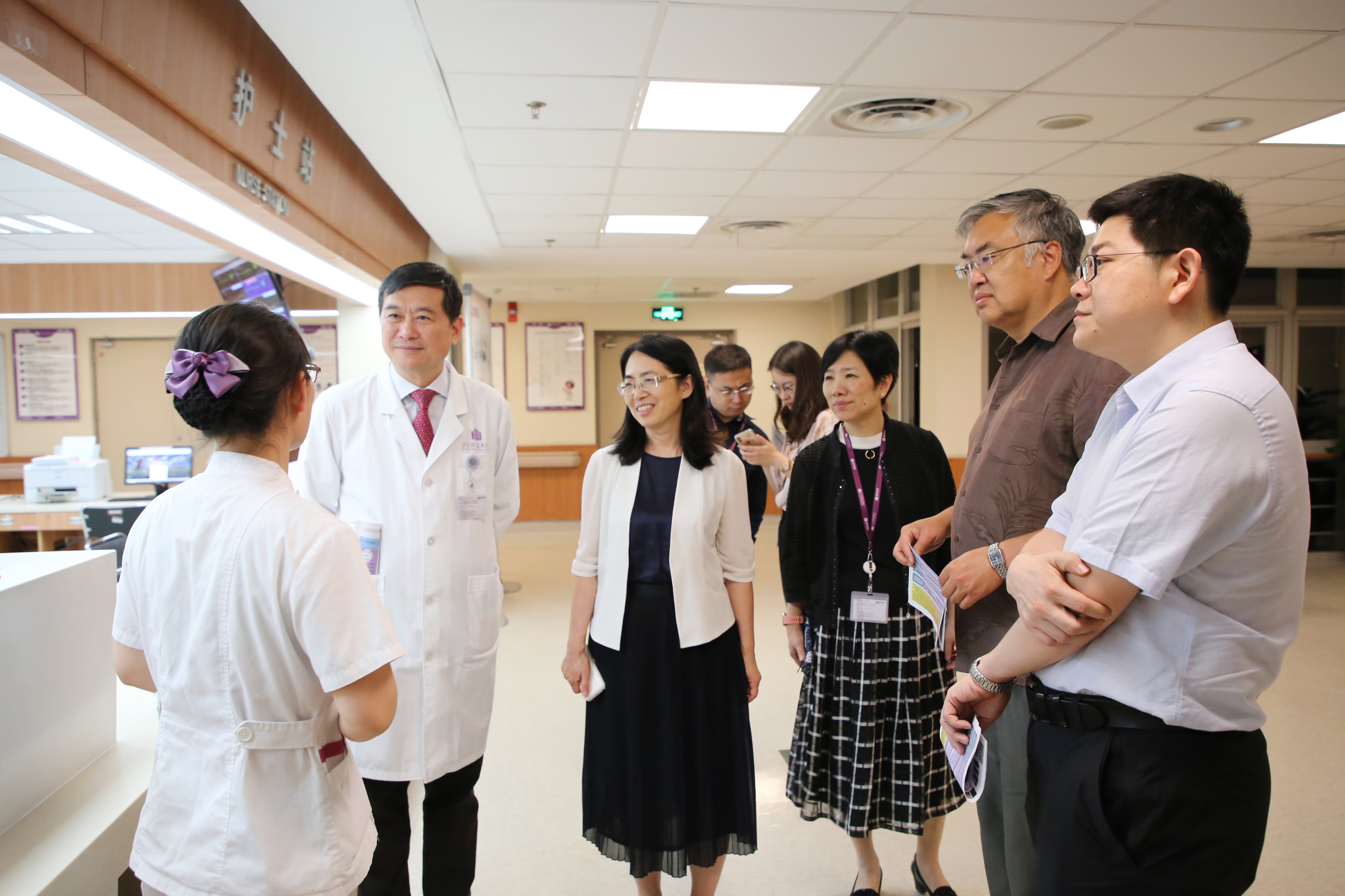 图为北京市医院管理中心医疗护理处刘立飞副处长与北京清华长庚医院医耗联动综合改革领导小组主要成员到临床一线进行改革督导与慰问
