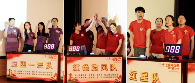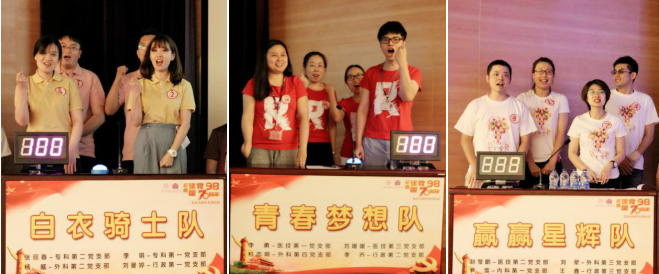 经过激烈的角逐,由行政第五党支部谭知晓、内科第四党支部陈乐、妇儿第一党支部何子倩、内科第三党支部李丹组成的“五四一三队”夺得团体一等奖。“白衣骑士队”和“青春梦想队”获得二等奖。“红色旋风队”、“红星队”、“赢赢星辉队”获得三等奖。颁奖仪式将在医院的“七一”表彰大会上举行。