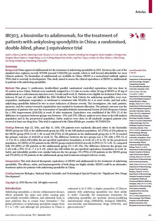 北京清华长庚医院9月1日电 伦敦时间2019年8月28日发布的《柳叶刀·风湿病学》(The Lancet Rheumatology)创刊号上,介绍了清华大学附属北京清华长庚医院徐沪济教授团队的一项研究成果。该研究证实:国产生物类似药IBI303相对于对照药阿达木单抗的临床等效性成立。该生物类似药有望降低强直性脊柱炎(AS)患者的治疗费用,使广大患者获益。