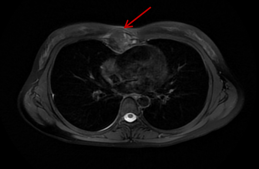然而切除胸骨肿瘤牵涉着多方面的问题。在降低手术风险的同时,肿瘤发于胸骨已经生长到皮肤出现凸起,可见肿瘤之大,胸部MRI检查提示肿瘤大小达3.3×2.8cm,为确保彻底切除肿瘤,则需要切除足够的胸骨及周围结构,同时要在保障胸廓完整性及胸腔脏器不受影响的同时,维持正常的呼吸运动,这就大大增加了胸骨重建的难度;小林尚小的年龄,日后的工作、婚姻生活,则让胸外科的医师团队再三思量植入假体后,患者长久呼吸动度的韧性、耐久性,以及术中刀口的把握,如何让术后的皮肤尽可能美观,以尽可能地降低这位尚未婚育的90后患者的顾虑。