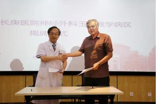 王克霞回顾了北京清华长庚院联合清华大学玉泉医院进行北京市住院医师规范化培训外科(神经外科方向)专业基地建设历程,两院联手将合力为清华大学神经外科的建设发展做出更多贡献,培养出优秀的清华神经外科人才。随后王劲和张玉琪分别代表双方医院签署《北京清华长庚医院神经外科(玉泉)教学病区合作协议》,全体与会领导共同揭牌。