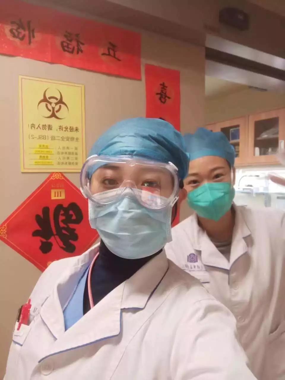 检验科的一对小姊妹在实验室搭伴过年。在科室里,她们的岗位危险系数最高——直接接触患者样本、接种、鉴定。