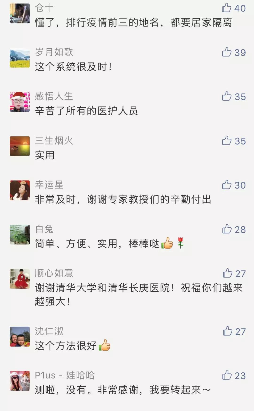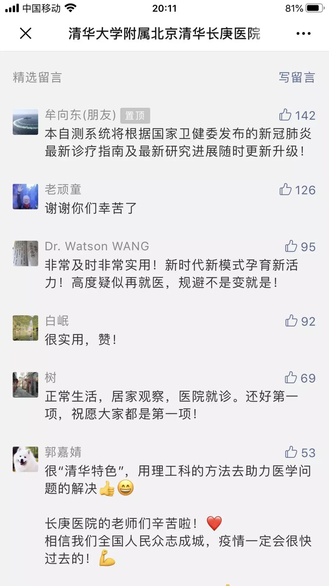 随着转发量增大、媒体加大宣传报道,“新型冠状病毒肺炎自测评估系统”收到了来自海内外受众的良好反馈,有来自基层医院的反馈运用该系统,“省了我们好多事儿”;也有同道反馈“经转发回馈,很多恐慌的人们心里踏实了”;也有网友反馈“很有清华特色,用理工科的方法助力解决医学问题”……