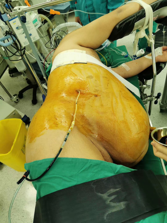 3月13日,泌尿外科主任李建兴坐镇指挥,肖博医师为患者实施超声引导下经皮肾镜手术,处理左肾结石。但是,由于李先生身形肥胖,身高165公分,体重却达到了110千克,体重指数(BMI)高达40.4kg/m2,麻醉后俯卧位时患者的机械通气受影响,呼吸道压力增高。为了患者的生命安全,只能放弃手术常规的俯卧位,改用侧卧位。虽然侧卧位和肥胖增加了超声引导下经皮肾镜手术的难度,但肖博凭借丰富的手术经验,准确定位,精准穿刺,快速清石,彻底清除左肾结石。