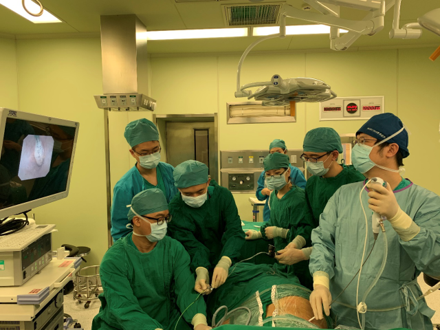 肖博医师(右一)和靳松住院总医师进行“双镜联合”手术