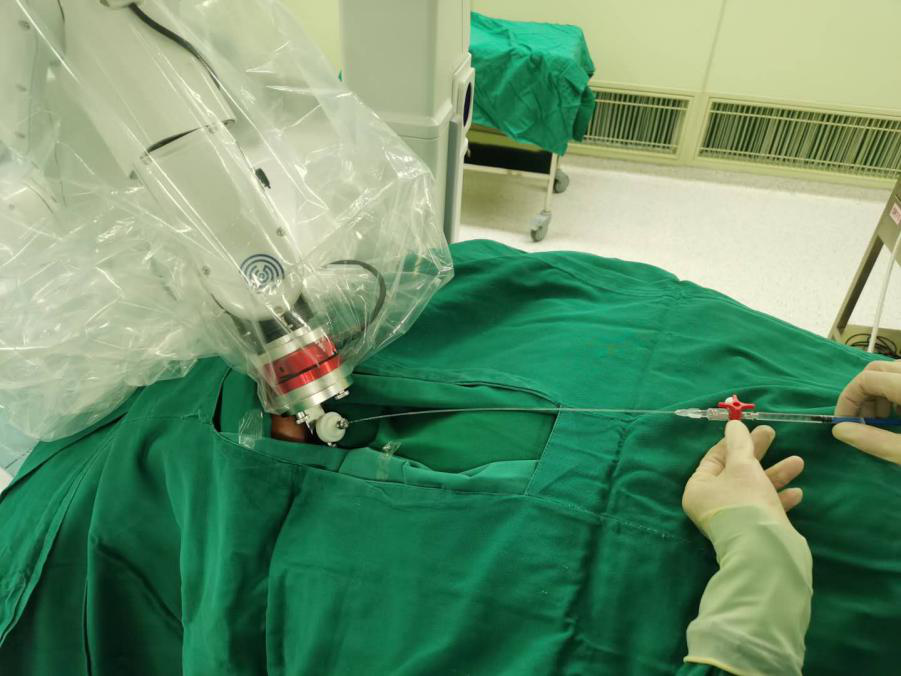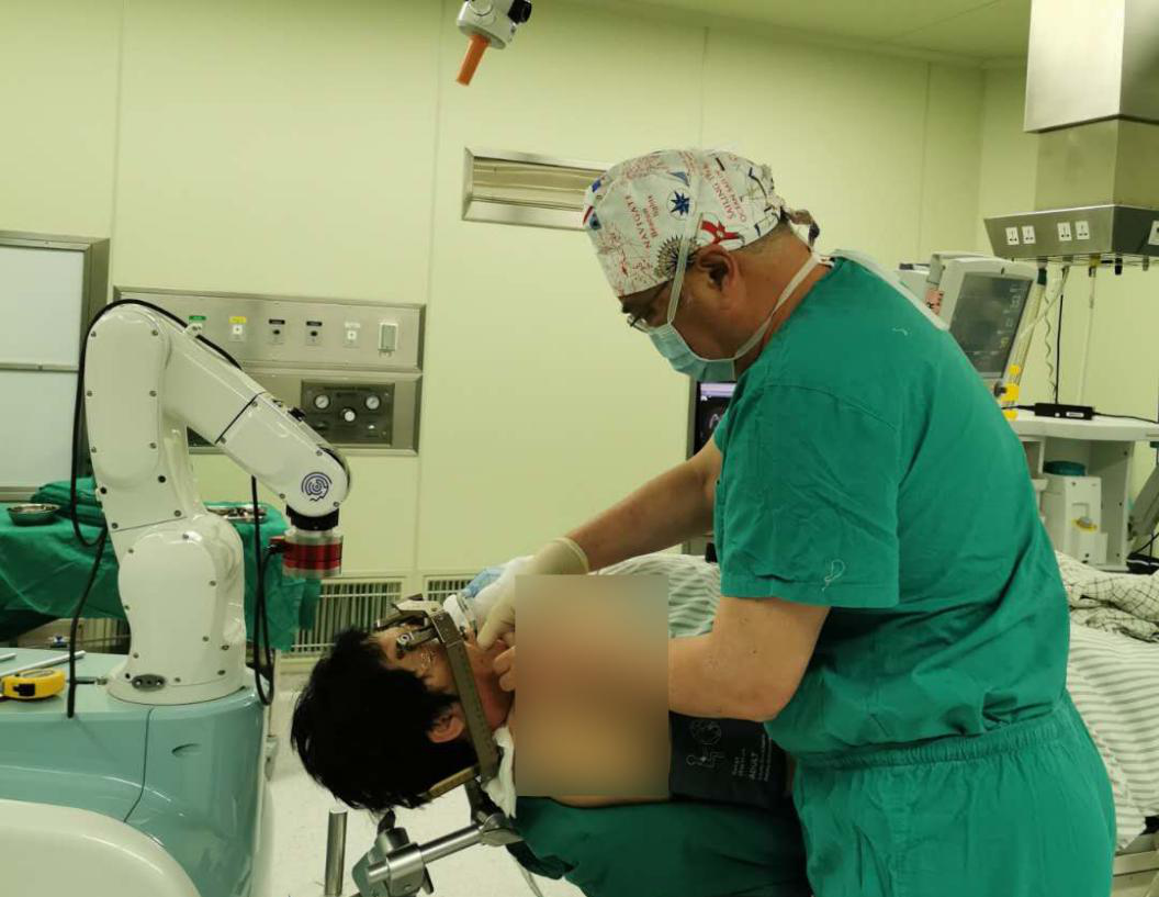 北京清华长庚医院运用机器人手术,其精度可达到亚毫米级,准确度更高,保证了一针入孔,实际术中仅用10秒钟即完成了穿刺操作,避免了重要血管、脑组织的损伤,而且减少了术中X线的照射,大大减少了患者的手术风险。同时,考虑到患者的美观和舒适,神经外科住院总医师董生将Leksell头架改装后连接手术机器人。这结合了立体定向技术和机器人技术,化繁为简,省略了患者需要剃发和在头上固定骨性标志点的操作。