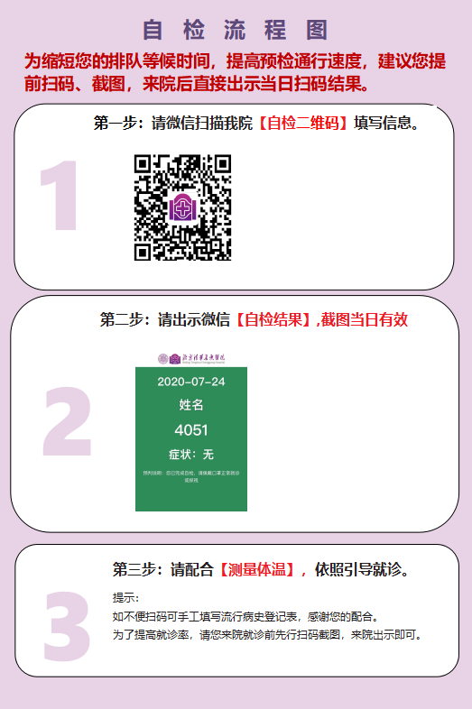 06/ 进入医院大门请出示北京健康宝,截图当日有效;进入医疗楼请使用微信扫描我院【自检二维码】。测量体温后无异常者方可进入医疗大楼,请保持等候距离间隔1米以上,根据引导就诊。