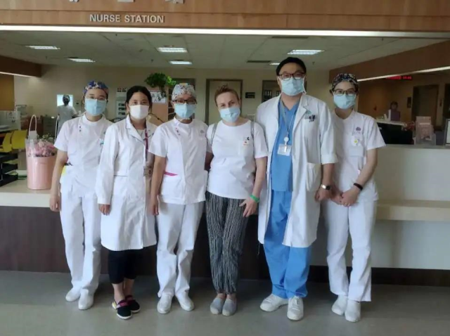 术后第三天,患者顺利出院,在护士站送上了一束鲜花表达感谢并合影留念。胃肠外科充分发挥科室医生国际化背景的优势,诊治了来自俄罗斯、白俄罗斯、乌克兰、美国、英国、马来西亚等多个国家的患有急腹症的患者,获得了患者及家属的一致好评。