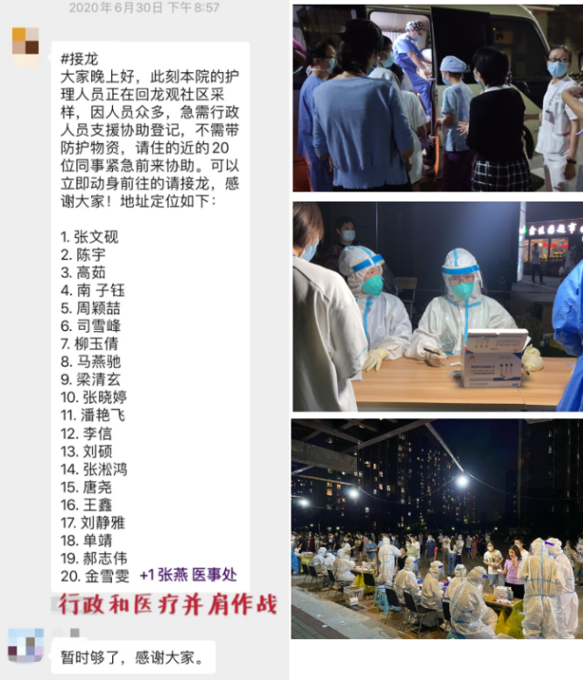 17点,检测工作开始后,到现场参与咽拭子采集的居民大大超出了预估的人数,除采集操作外,医务人员还要快速完成登记、贴标识等动作。晚上8点半,结合现场的情况,北京清华长庚医院人力资源部、护理部紧急协调,再增援20名医护人员。与此同时,医院行政团队支援预检分诊的微信群里,发动行政支援的消息也开始接龙了,20多分钟里,平均每分钟都有行政人员响应,大家迅速从医院、各自的家中向回龙观社区奔去。穿上防护服,做好登记;随时收集登记表单,转移、补充物料。
